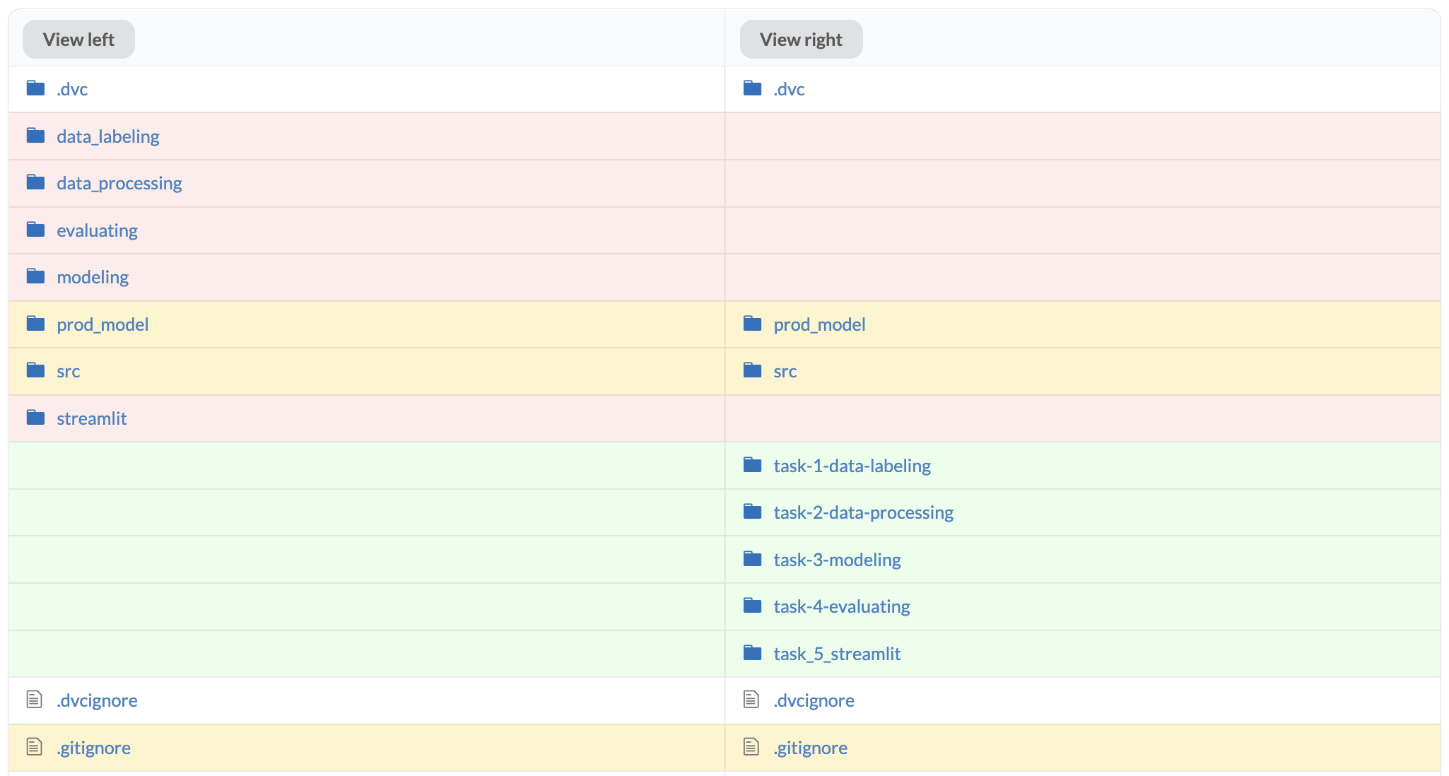 We consider the directory diff a bird's eye view, indicating which directories were modified to understand the overall changes. It uses the same color format as text diff (green - new directory, white - no changes, yellow - modified, red - deleted) but refers to files within the directory. DagsHub Diffing will use the same color format for files placed at the same tree level (e.g., dvc.yaml).