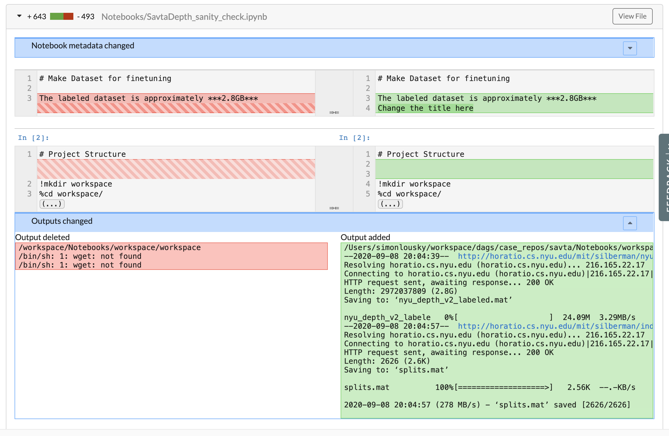 DagsHub Diffing also renders notebook diffs, highlighting changes in cell inputs, outputs as well as notebook metadata.