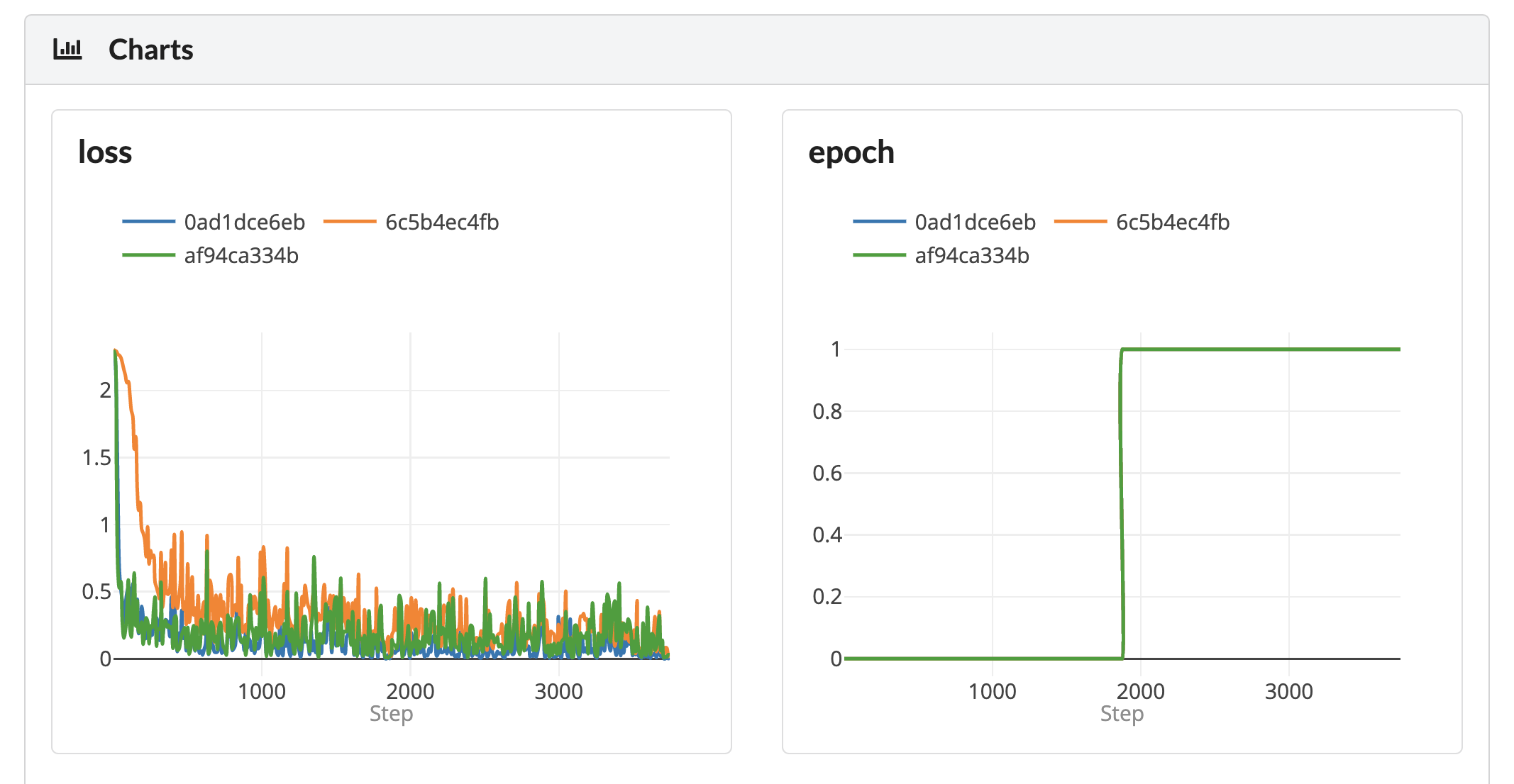 The last section of the comparison view is a list of charts that include all metrics that exist for the compared experiments. Each chart includes lines for the relevant compared experiments.
