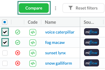 The comparison table shows the different metadata, parameters, and latest metric values in a table view. This can help show how different parameter choices affected performance, and is probably more suitable when you compare a relatively small amount of experiments.