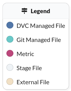Files may also be imported to your repository from external sources, such as the source to a dataset you may be using. These are color-coded pastel yellow. They are created using dvc import.