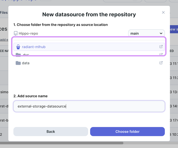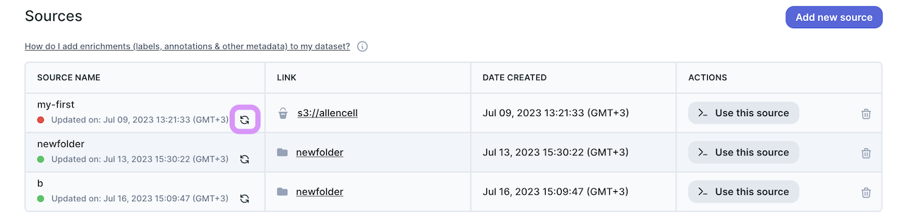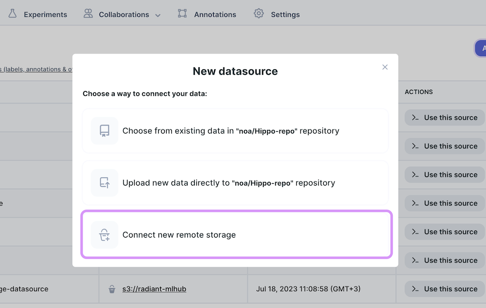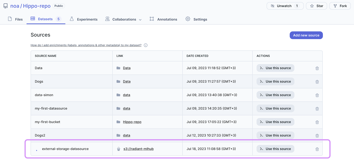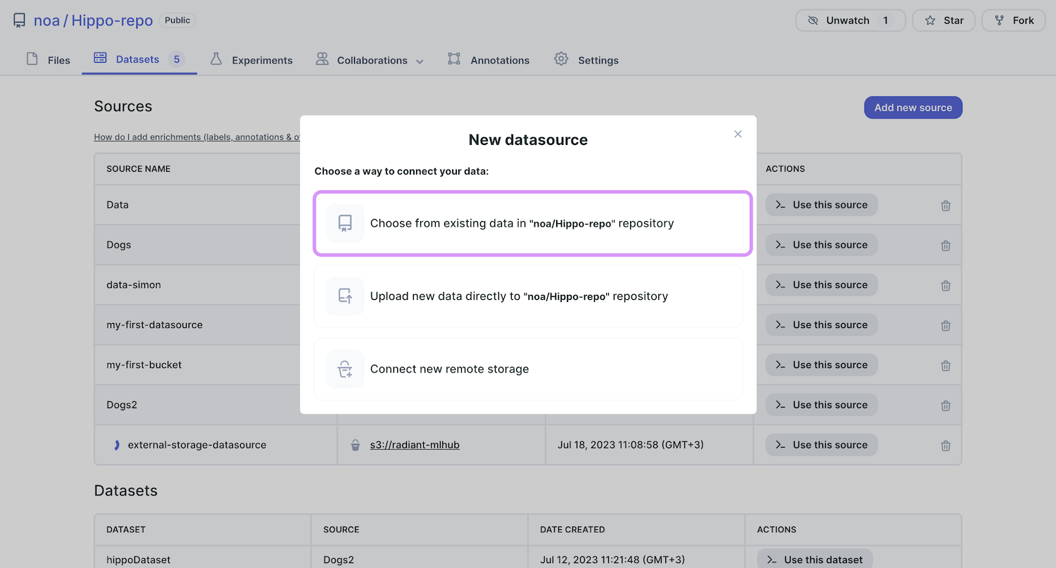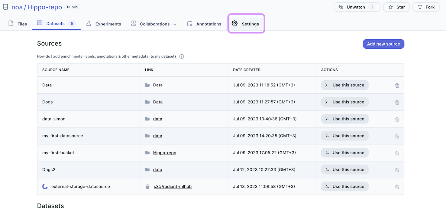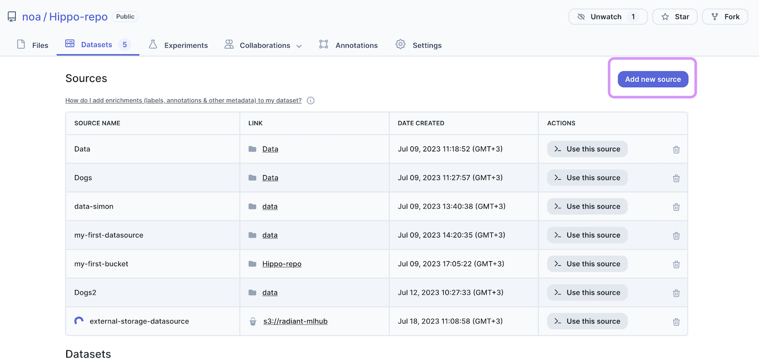 In your repository, navigate to the Datasets tab and click on the ‘Add new source’ button.
