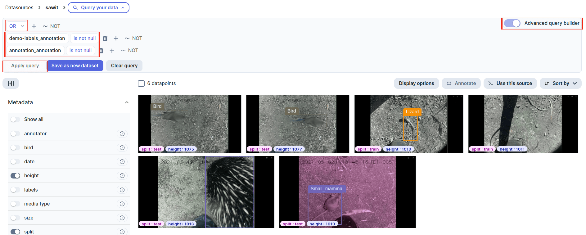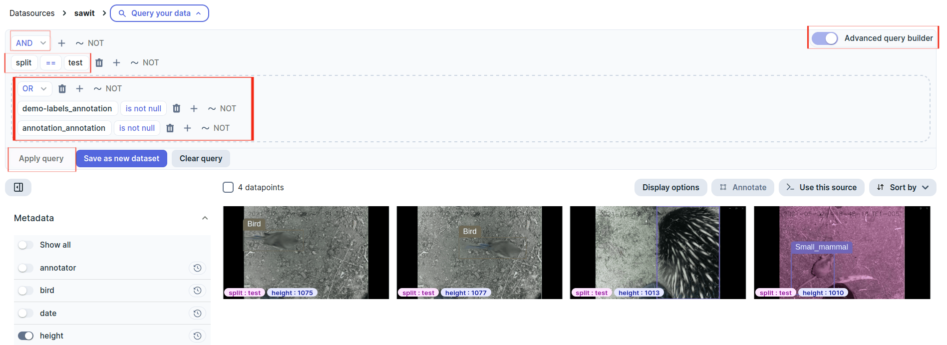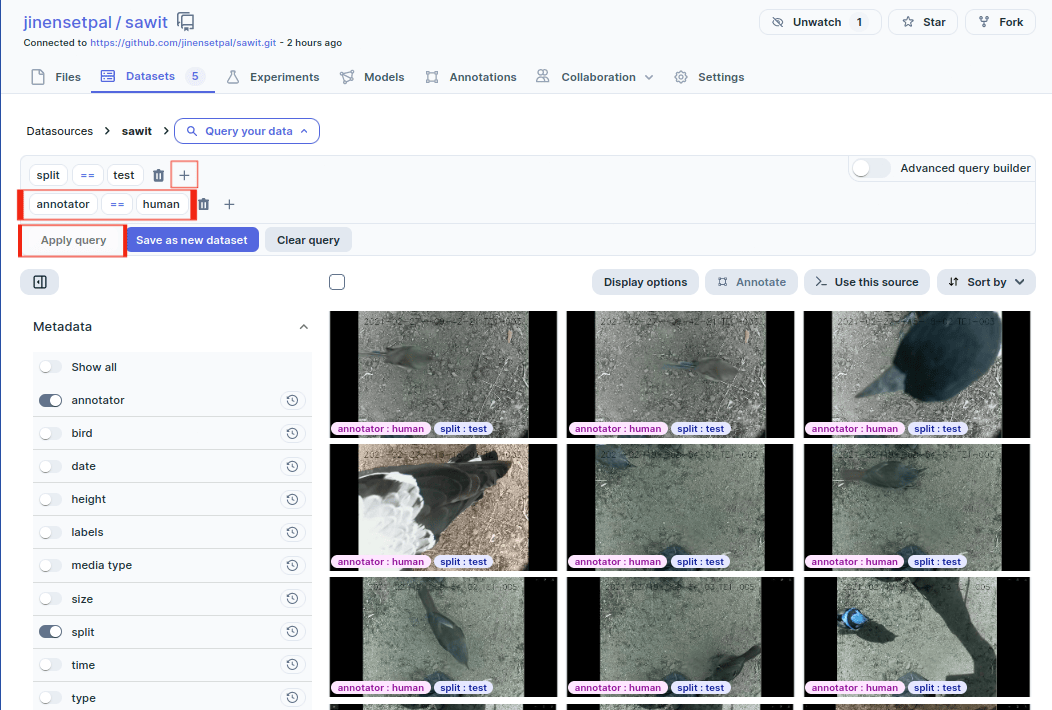 By default, queries are sets of AND conditions. Datapoints that evaluate to true for every condition are returned. For example, in the Sawit dataset project, to find the birds annotated by humans in the test split, you can: