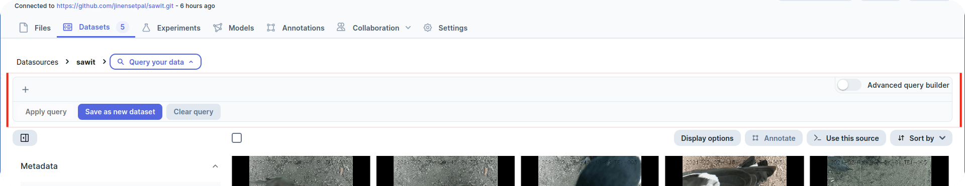 Going back to the Sawit project, we can see that our metadata consists of annotations by two separate LabelStudio annotation projects. We can connect these two with an OR clause: