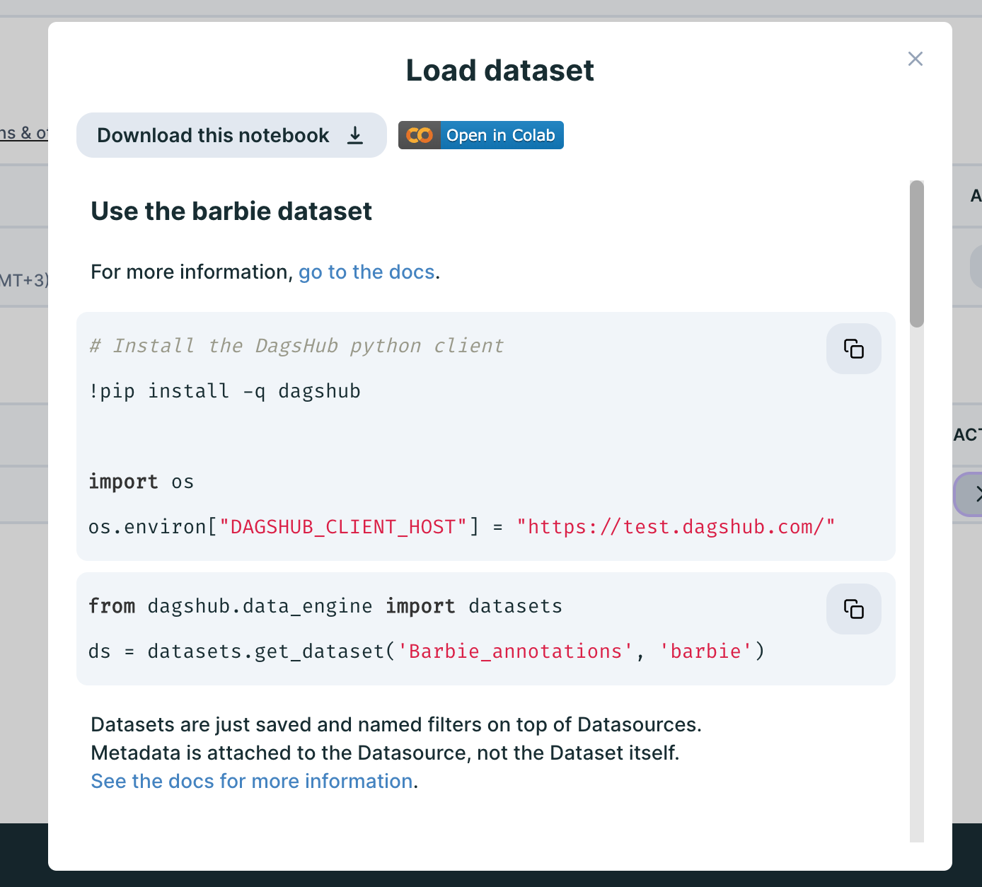Where you'll see a notebook full of copyable code snippets enabling you to use your dataset: