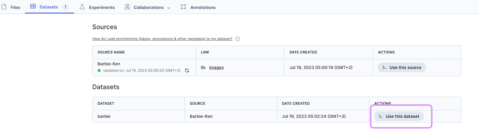 Or navigate to the datasets tab in your repository, click on the Use this dataset button attached to the relevant dataset, and follow the instructions: