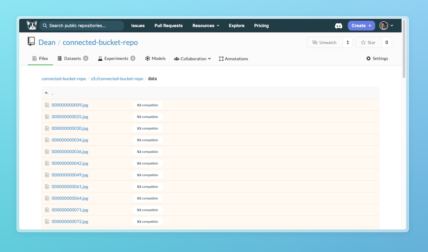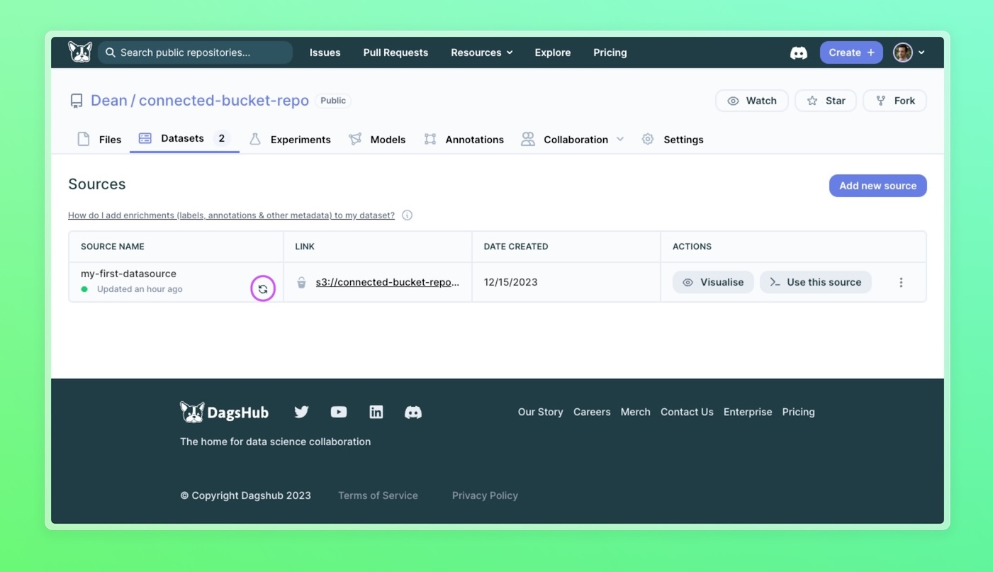 Now that our data is in our DagsHub repository, we can create a datasource from it.